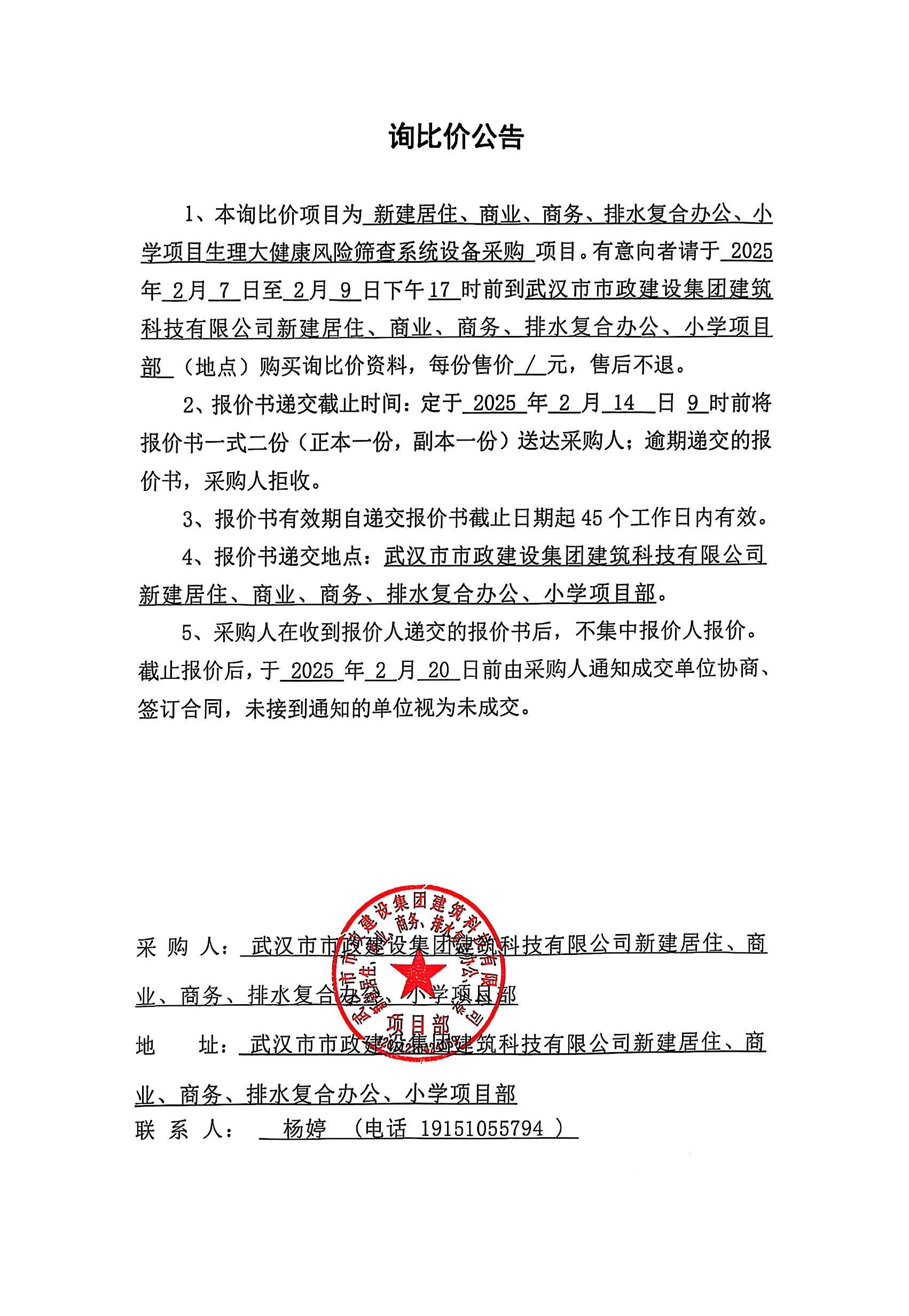 武漢市市政建設(shè)集團建筑科技有限公司新建居住、商業(yè)、商務(wù)、排水復合辦公、小學項目生理大健康風險篩查系統(tǒng)設(shè)備采購詢價公告